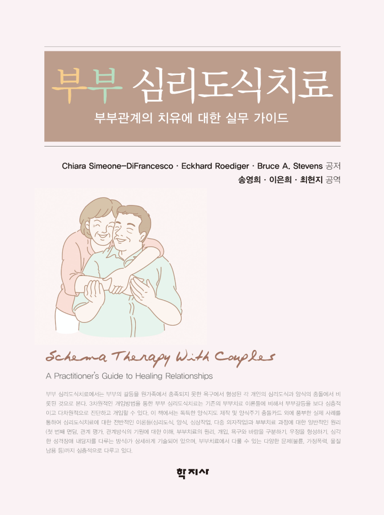 독특한 양식지도 제작 및 양식주기 충돌카드 외에 풍부한 실제 사례를 통하여 심리도식치료에 대한 전반적인 이론들(심리도식, 양식, 심상작업, 다중 의자작업)과 부부치료 과정에 대한 일반적인 원리(첫 번째 면담, 관계 평가, 관계방식의 기원에 대한 이해, 부부치료의 원리, 개입, 욕구와 바람을 구분하기, 우정을 형성하기, 심각한 성격장애 내담자를 다루는 방식)가 상세하게 기술되어 있으며, 부부치료에서 다룰 수 있는 다양한 문제(불륜, 가정폭력, 물질남용 등)까지 심층적으로 다루고 있는 이 책은 부부심리도식치료(Schema TherapyCoples) 실무지침서로서 많이 활용될 것으로 기대됩니다